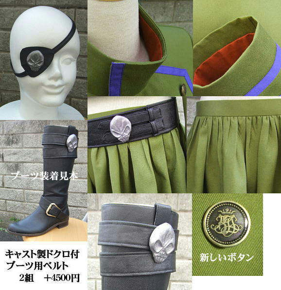 | 制服上着 腰履きスカート (Mサイズ・前部分丈約28cm・後ろ部分約31cm) 眼帯(ドクロ付) ウエストベルト(ドクロ付) |