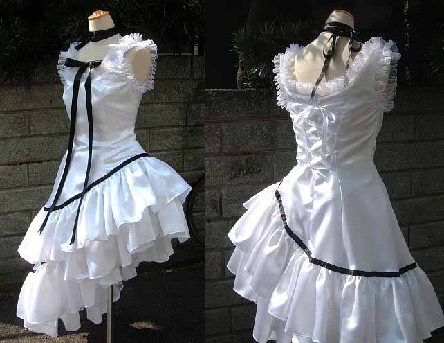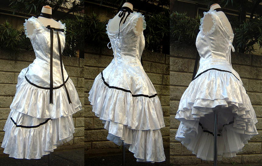 | ■縫製は職業用ミシンとロックミシンを使用し丁寧に縫っています。 ■上品な光沢で柔らかいサテンでさわり心地も着心地も良いです。 ■ワンピース・スカート共にフリルがたっぷりと寄せてあり、2段のフリルが豪華に見えます。 全円のスカートですので、座った時は綺麗に円に広がります。 ■身頃には裏地をつけていますので、 白ですが下着が透ける心配はありません。 ■背中が編み上げでサイズ調節が可能になっておりますので Sサイズ〜Lサイズの方まで問題なく着用頂けると思います。 ■材料費も高く、あまりに手間がかかりましたので、今後の製作予定は未定です。 2人セットで着用予定、黒ドレス製作ご希望の方はご連絡下さい。 |