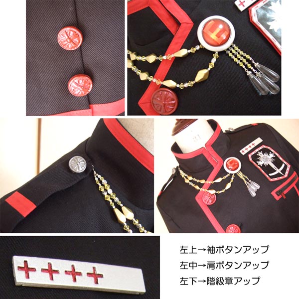 団服デザインのボタンはキャスト製です。 ブローチの赤部分はクリア樹脂製で、 Eの文字が写真にも綺麗に写るように工夫されています。 ■ワッペン、階級章は手縫いで縫い付けてございます。 ボタン、ワッペン、階級章、ブローチは、お洗濯が出来ませんので、 お洗濯をされる場合は必ず取り外してください。 ■ブローチはブローチ本体と鎖部分にピンがついてございますので、