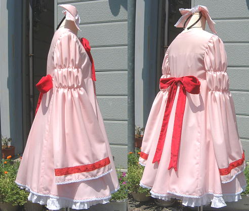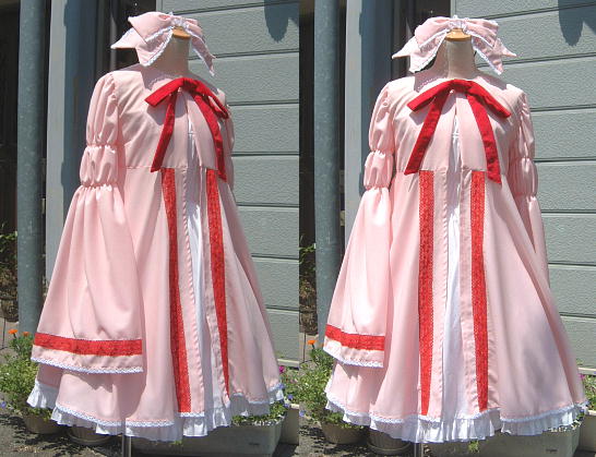 | ■縫製は職業用ミシンとロックミシンを使用し丁寧に縫っています。 ■綿フリルをふんだんに使って居りますので、 ふんわりしたシルエットの 豪華な衣装になっております。 ワンピース本体の赤レースは白のケミカルレースを赤に染めています。 しっかり染めており、色止めもしておりますが、 手染めになりますので、 お洗濯の際は色落ちにご注意下さい。 裾広がりの長めの袖が可愛らしい感じに仕上がっています。 画像では袖パフの部分がしぼんでしまっていますが、 腕を通すと2段のシャーリングがぴったりと腕に止まり綺麗にふくらみがでます。 背中のリボンはしっかりとワンピースに縫い付けています。 胸リボンはブローチピンで付けて下さい。 アンダーワンピースはシャーリングで着用していただく ビスチェスタイルに作っておりますので、 着やすく、在る程度のサイズの融通は御座います。 原作に近づけるため、アンダーワンピースとドロワーズには 惜しみなくフリルを使用しております。 ヘッドドレスはカチューシャ型になっておりますので、着用も簡単です ♪ ■画像はパニエを着用させ少しだけスカートに広がりをもたせています。 セットにパニエは含まれません。ご注意下さい。 |