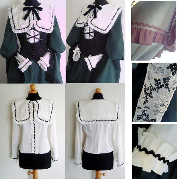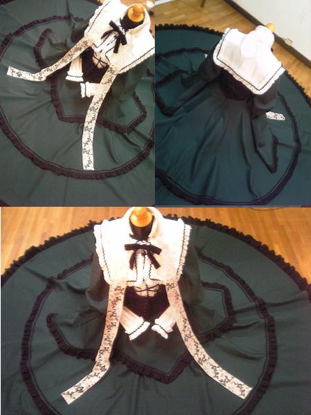 | ■縫製は職業用ミシンとロックミシンを使用し丁寧に縫っています。 ■ジャケットは、前ボタンと編み上げで着用していただくようになっておりますので、 バストサイズは在る程度の調節が着用者の方でしていただけ、 ウエストラインが美しく見えるようなシルエットに仕上げております。 リボンはブローチピンで留めて頂く形です。 原作に近いくなるようにスカートはフルサーキュラー(全円)で 制作しておりますので、座りポーズでの撮影にもおすすめです! ヘッドドレスはカチューシャ型になっておりますので、着用も簡単です ♪ ヘッドドレスに付属しているレースは、市販品にピン!とくる物が無かったので、 白地のレースを紅茶でベージュに染めておりますので、自然な風合いで 翠星石のイメージに合わせてあります。 しっかり染めておりますが、手染めになりますので、 お洗濯さの際は色落ちにご注意下さい。 |