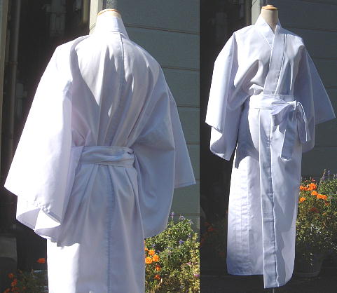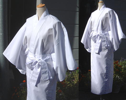 | 縫製は職業用ミシンとロックミシンを使用し丁寧に縫っています。 縫製作業はミシン使用ですが、 作り方を正規の襦袢の形で製作し綺麗な仕上がりになっております。 白でも透けない程度のしっかりした厚みの布で製作しています。 寒い季節の防寒に死神装束の襦袢としても着用可能です。 身長155〜160cm程度の人が着て、 足首から少し短い程の着丈になります。 身長に合わせて裾上げできますのでご相談下さい。 |