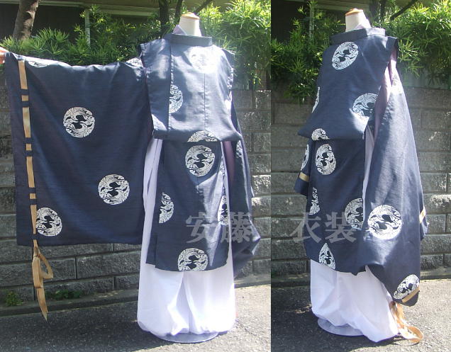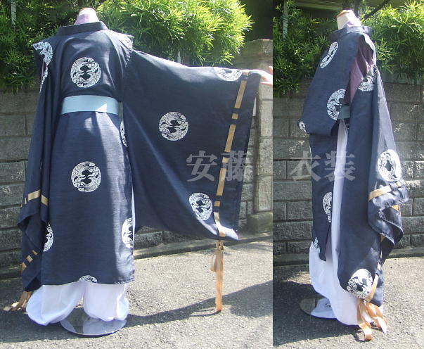 | 縫製は職業用ミシンと端始末は主にロックミシンで綺麗に端処理しております。 ボディは女性体型の洋服用ボディに着せてありますことをご了承下さい。 衣装は男仕立ての形をとりながら、より女性が着やすく仕上げました。 縫製作業はミシン使用ですが正規の着物の形で製作していますので、 沢山の布量と丁寧に手間をかけた衣装になり、その分綺麗な仕上がりになっております。 作り方を正規の着物の作り方で、 デザインを舞一夜の多季史に近くなるよう製作しております。 狩衣は、本来の縫製をもとに、よりキャラクターに近くなるよう努めました。 はっきりと見える襟元のみ緑の裏地をつけています。 狩衣を緑色の総裏地で製作する事も可能です。 模様はアイロンプリントです。 アイロンをかけるには、同封のアイロンプリント用あて紙が必要です。 長襦袢は見える部分の白襟パーツのみです。 うす紫着物にホックで留めるように作りました。 袴は、腰まわりの形を本格的に、脇もあけて製作しています。 裾ははきやすくゴムを使いました。 着物の着方・保存方法・御手入れの仕方は 注意点を書きまして同封させて頂きます。 着物保存用のたとう紙に包装して発送致します。 注意:アイロンプリントの絵柄は3段目の画像を参考にして下さい。 1段目・2段目の見本画像はアイロンプリントの印刷ミスで左右反転の絵柄になってしまいました試作品です。 今後製作のご注文分は画像3枚目の正確な絵柄のプリントでお届け致します。 |