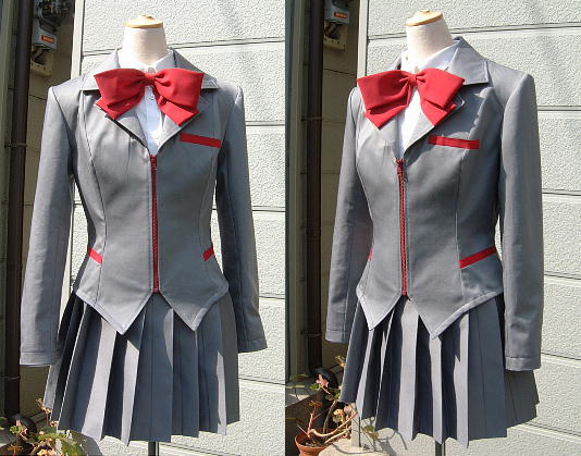 | ■縫製は職業用ミシンとロックミシンを使用し丁寧に縫っています。 ■上着・スカート・リボンのセットになります。 ブラウスはセットに含まれませんのでご注意下さい。 上着はファスナーでの着脱ですので、衣装を着るのも簡単です。 原作漫画イラストのとうりに肩から胸にかけて縫い合わせしてあります。 ウエストを細身にシェイプしたラインで作りましたので、 着用時にすっきりとしたシルエットで見目良く写ると思います。 襟・身頃見返しはしっかりと接着芯を貼り、肩パットも付けており、 ブレザーの形を綺麗に保つようきちんと製作してあります。 袖は、内袖と外袖の2枚はぎで作っております。 胸・ウエストのえんじラインは飾りのみでポケットの使用はできません。 リボンは柔らかな素材で製作しており、手触りも良い品です。 ブローチピンで留めて着用下さい。 |